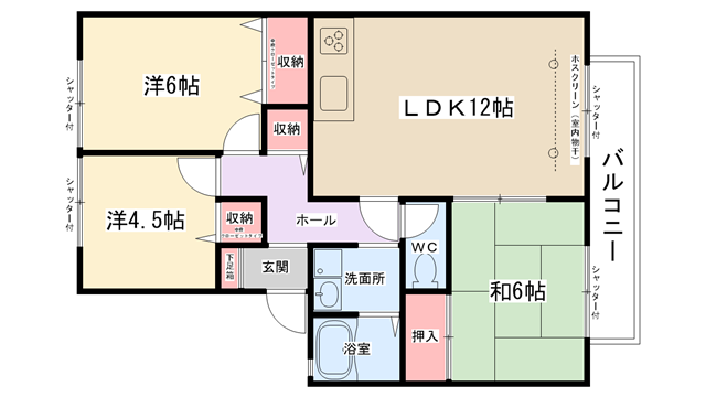 間取り内訳 | DK12帖・洋室6帖・洋室4.5帖・和室6帖 | 駐車場 | 敷地内あり 5,500円 |
