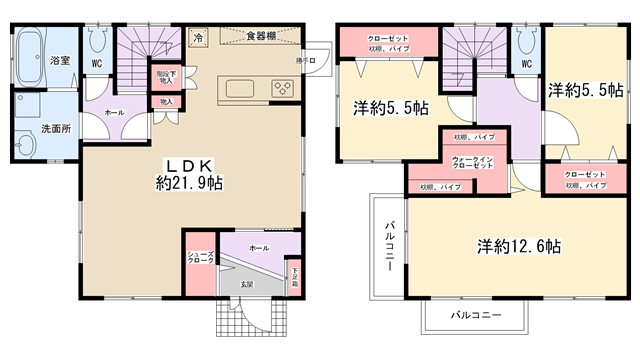 間取り内訳 | LDK21.9帖・洋室12.6帖・洋室5.5帖・洋室5.5帖 | 駐車場 | 敷地内あり(1台分付き) |