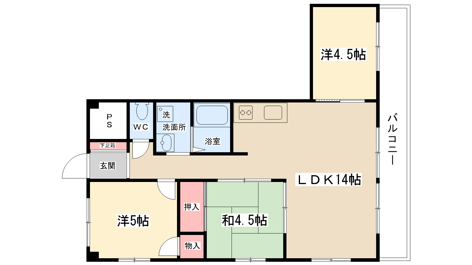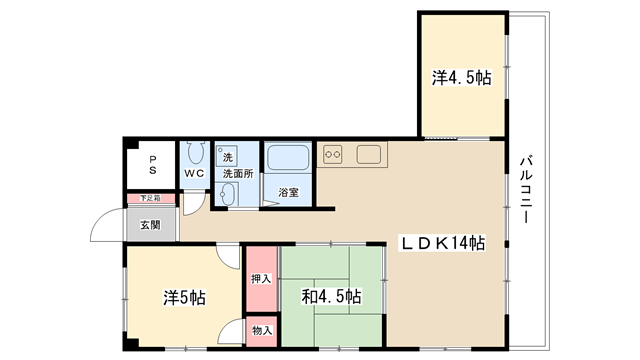 間取り内訳 | 和室4.5帖・LDK14帖・洋室5帖・洋室4.5帖 | 駐車場 | 敷地内あり 8,000円 |