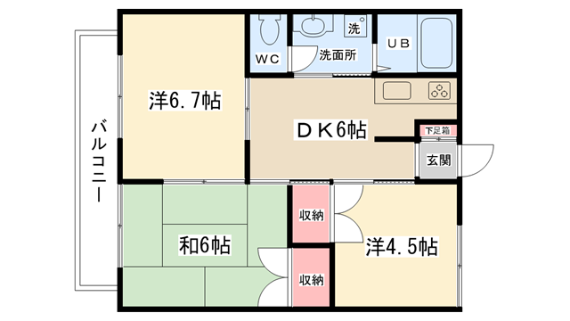 間取り内訳 | DK6帖・洋室6.7帖・和室6帖・洋室4.5帖 | 駐車場 | 敷地内あり 5,500円 |