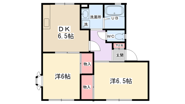 | 間取り内訳 | 洋室6帖・洋室6.5帖・DK6.5帖 | 駐車場 | 敷地内あり(1台分付き) | ||||