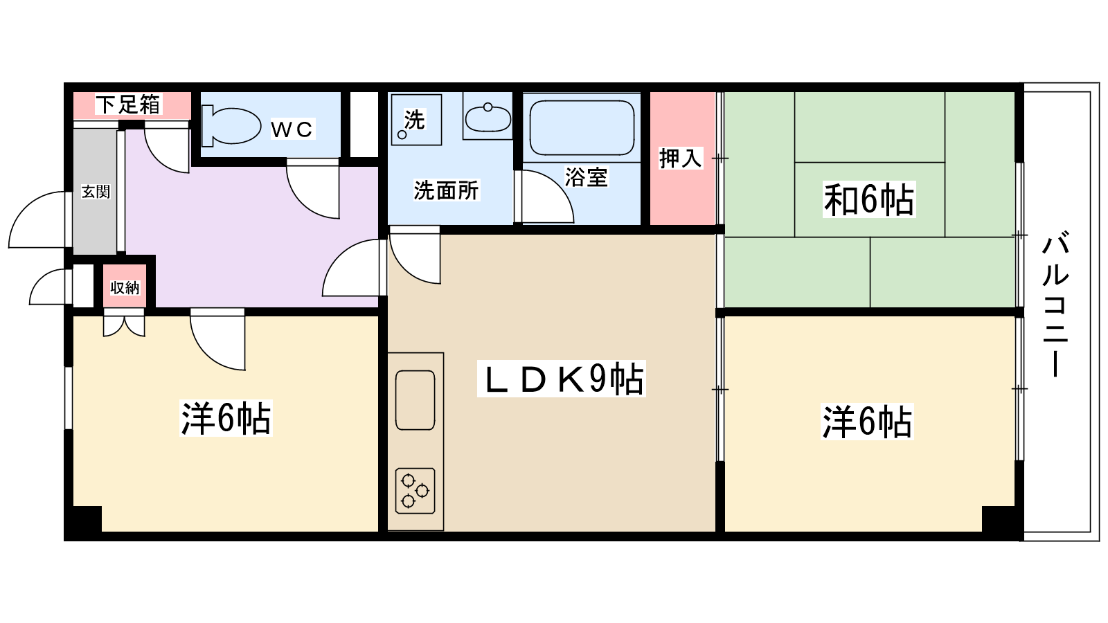 | 間取り内訳 | 和室6帖・洋室6帖・洋室6帖・LDK9帖 | 駐車場 | 近隣あり 11,000円 | ||||