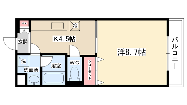 | 間取り内訳 | 洋室8.7帖・K4.5帖 | 駐車場 | 敷地内あり 10,000円 | ||||