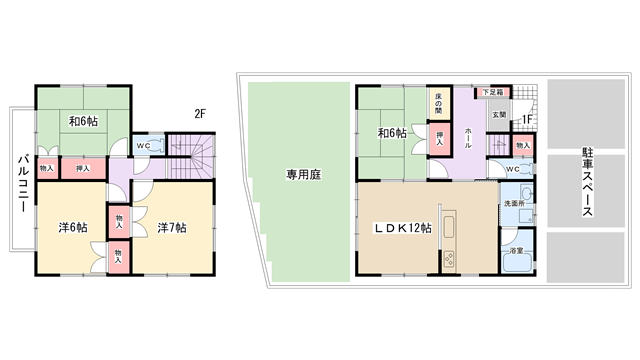 | 間取り内訳 | LDK12帖・洋室7帖・洋室6帖・和室6帖・和室6帖 | 駐車場 | 敷地内あり(1台分付き) | ||||
