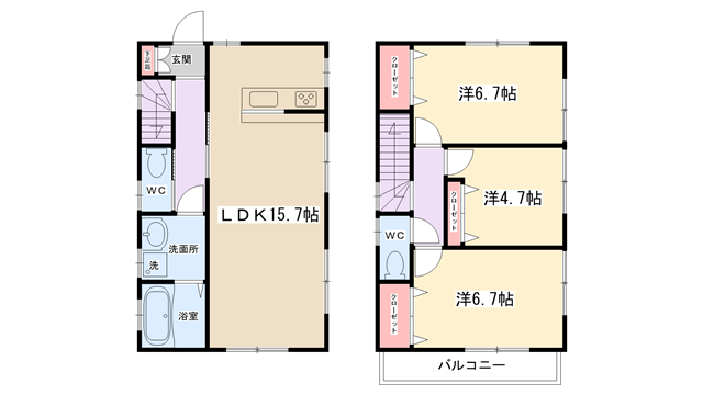 | 間取り内訳 | LDK15.7帖・洋室6.7帖・洋室6.7帖・洋室4.7帖 | 駐車場 | 敷地内あり(1台分付き) | ||||