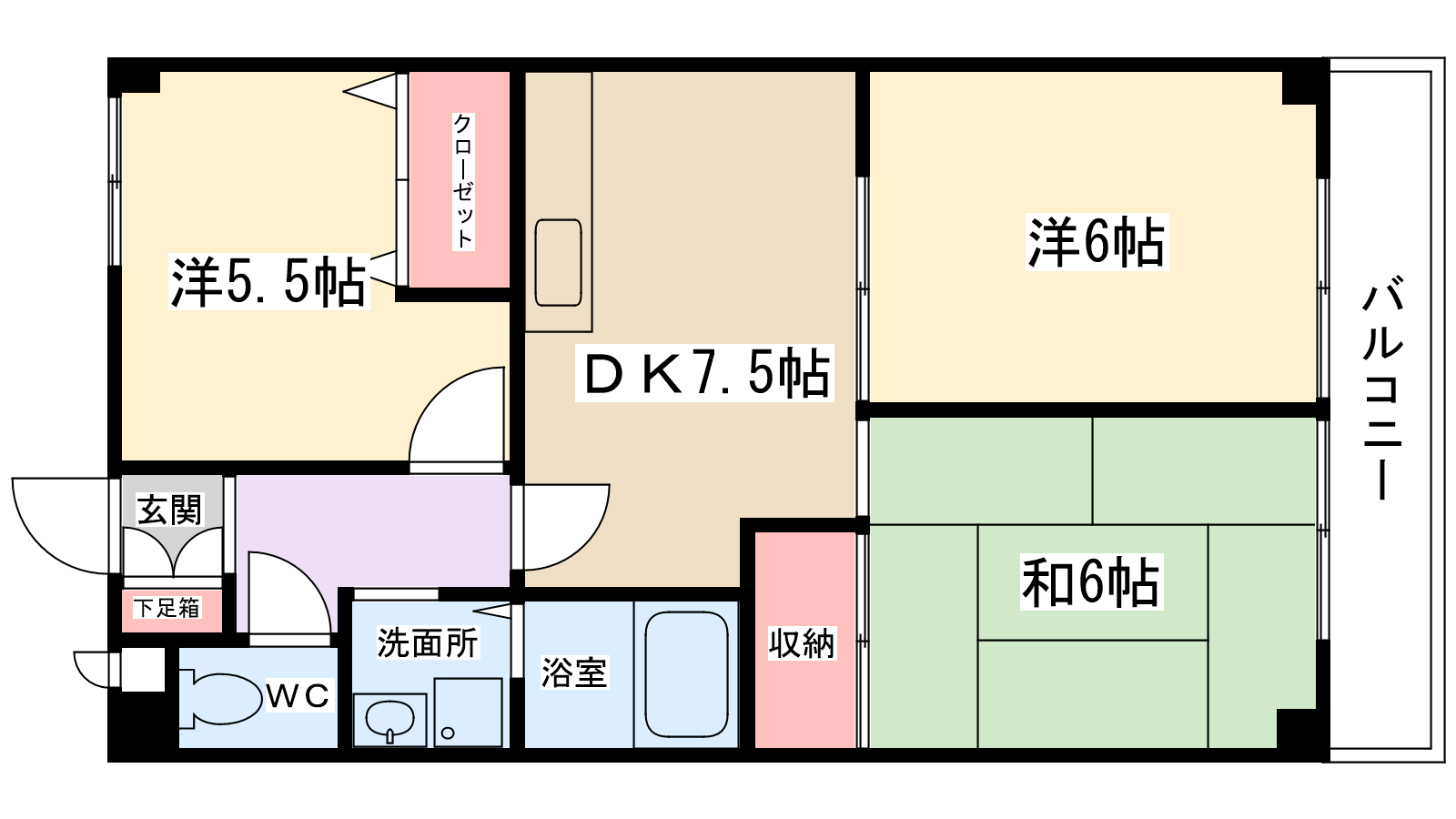 | 間取り内訳 | 洋室6帖・洋室5.5帖・和室6帖・DK7.5帖 | 駐車場 | なし | ||||