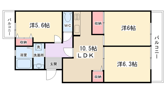 | 間取り内訳 | LDK10.5帖・洋室6帖・洋室6.3帖・洋室5.6帖 | 駐車場 | 敷地内あり 8,800円 | ||||