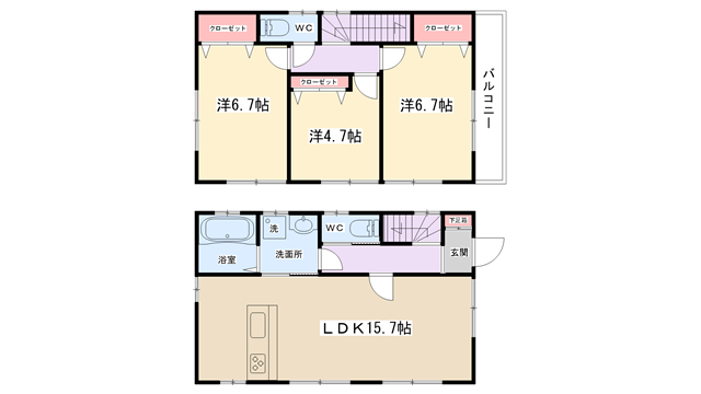 | 間取り内訳 | LDK15.7帖・洋室6.7帖・洋室6.7帖・洋室4.7帖 | 駐車場 | 敷地内あり(1台分付き) | ||||