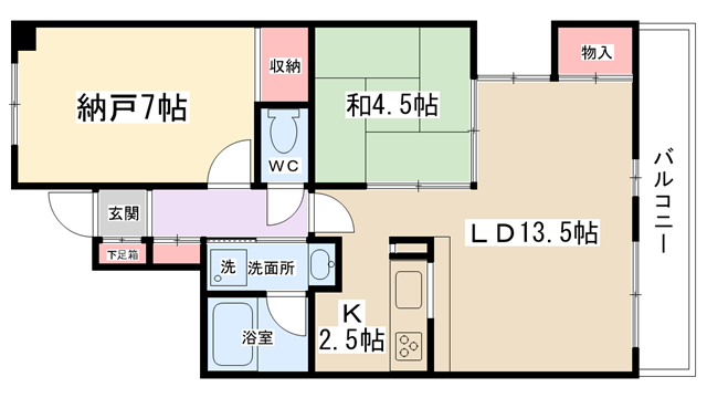 | 間取り内訳 | LD13.5帖・和室4.5帖・S7帖・K2.5帖 | 駐車場 | 敷地内あり 9,000円 | ||||