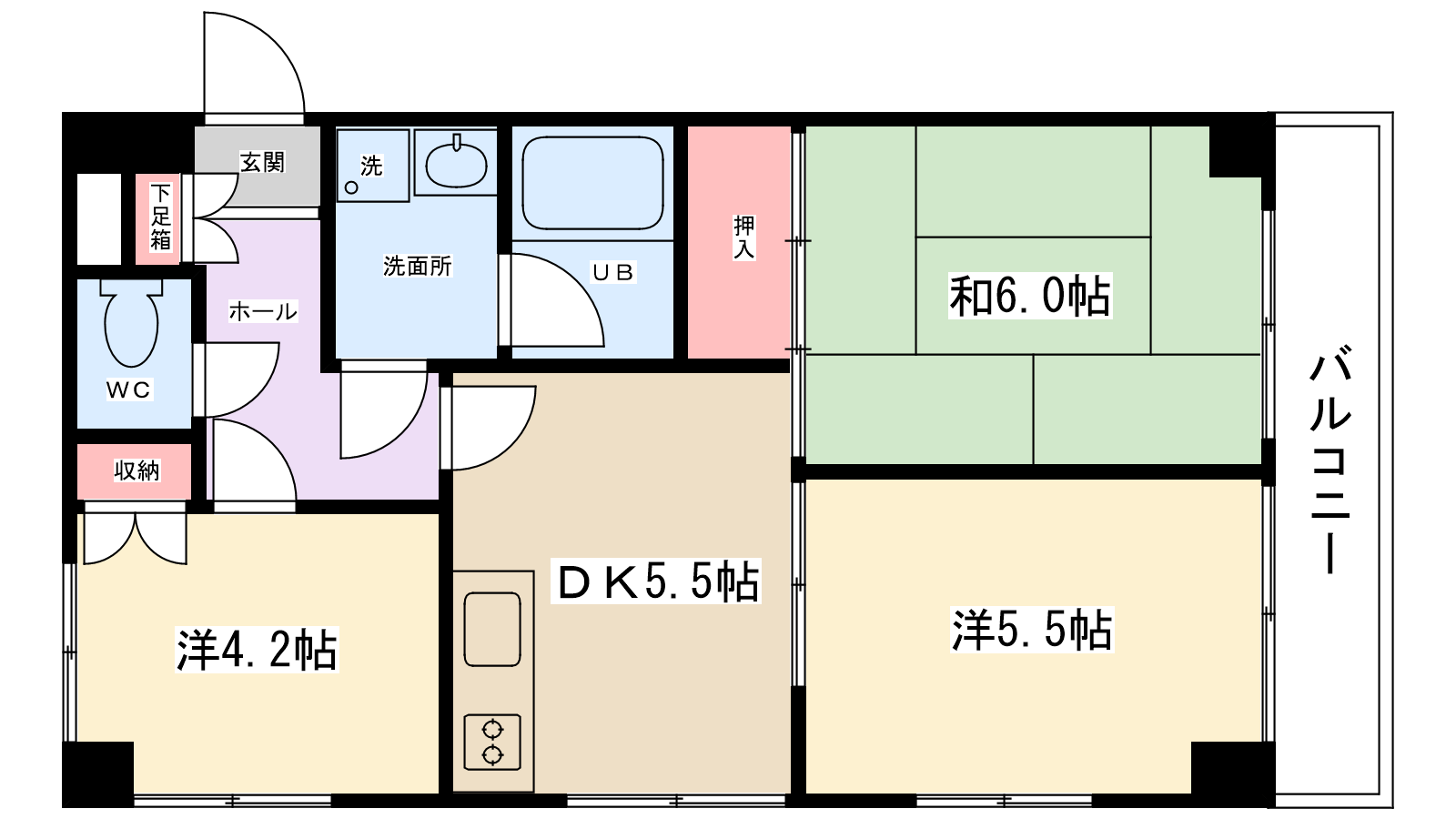 | 間取り内訳 | DK5.5帖・洋室5.5帖・和室6帖・洋室4.2帖 | 駐車場 | なし | ||||