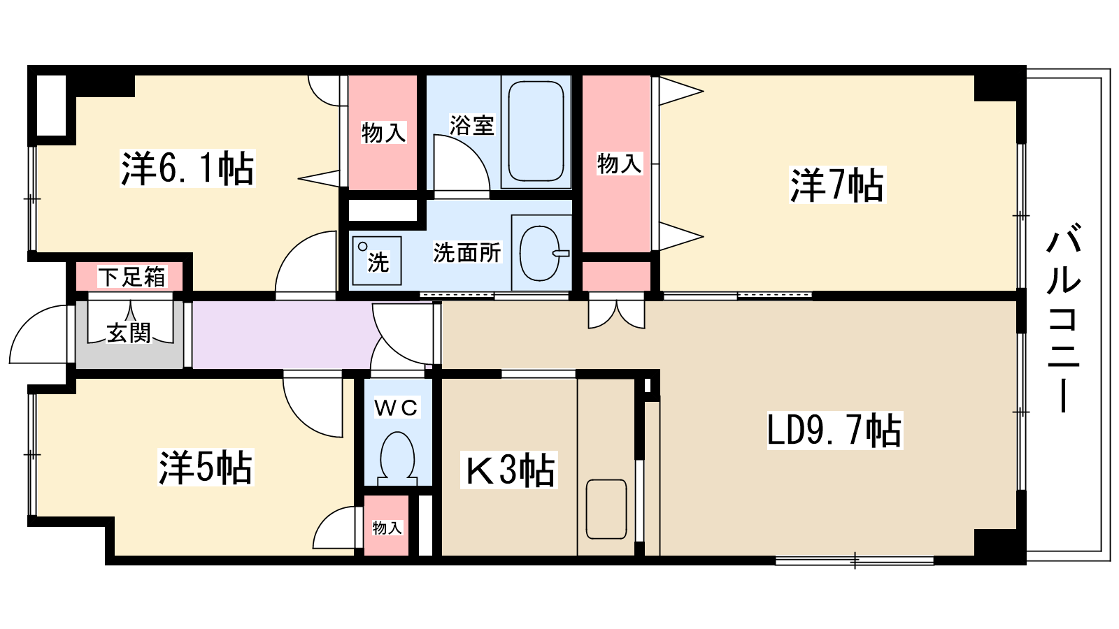 | 間取り内訳 | 洋室5帖・洋室6.1帖・洋室7帖・LDK12.7帖 | 駐車場 | 敷地内あり 6,600円 | ||||