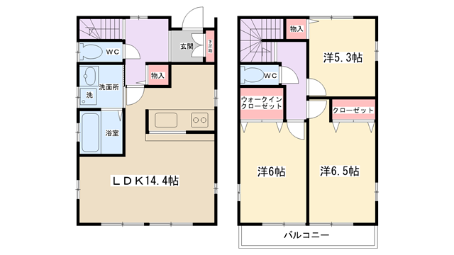 | 間取り内訳 | LDK14.4帖・洋室6.5帖・洋室6帖・洋室5.3帖 | 駐車場 | 敷地内あり(1台分付き) | ||||