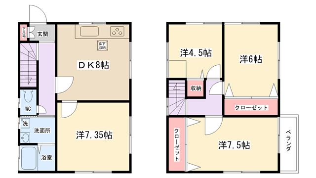 | 間取り内訳 | DK8帖・洋室7.5帖・洋室6帖・洋室4.5帖・洋室7.35帖 | 駐車場 | 敷地内あり(1台分付き) | ||||