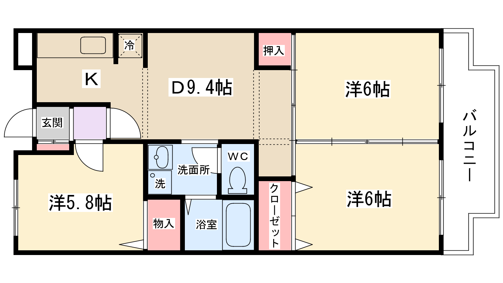 | 間取り内訳 | 洋室6帖・洋室6帖・洋室5.8帖・DK9.4帖 | 駐車場 | 近隣あり 8,800円 | ||||