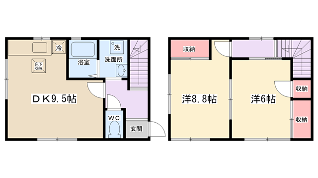 | 間取り内訳 | DK9.5帖・洋室8.8帖・洋室6帖 | 駐車場 | 敷地内あり(1台分付き) | ||||