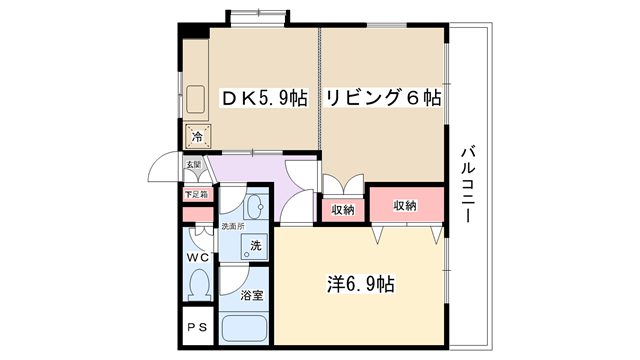 | 間取り内訳 | 洋室6.9帖・LDK11.9帖 | 駐車場 | なし | ||||